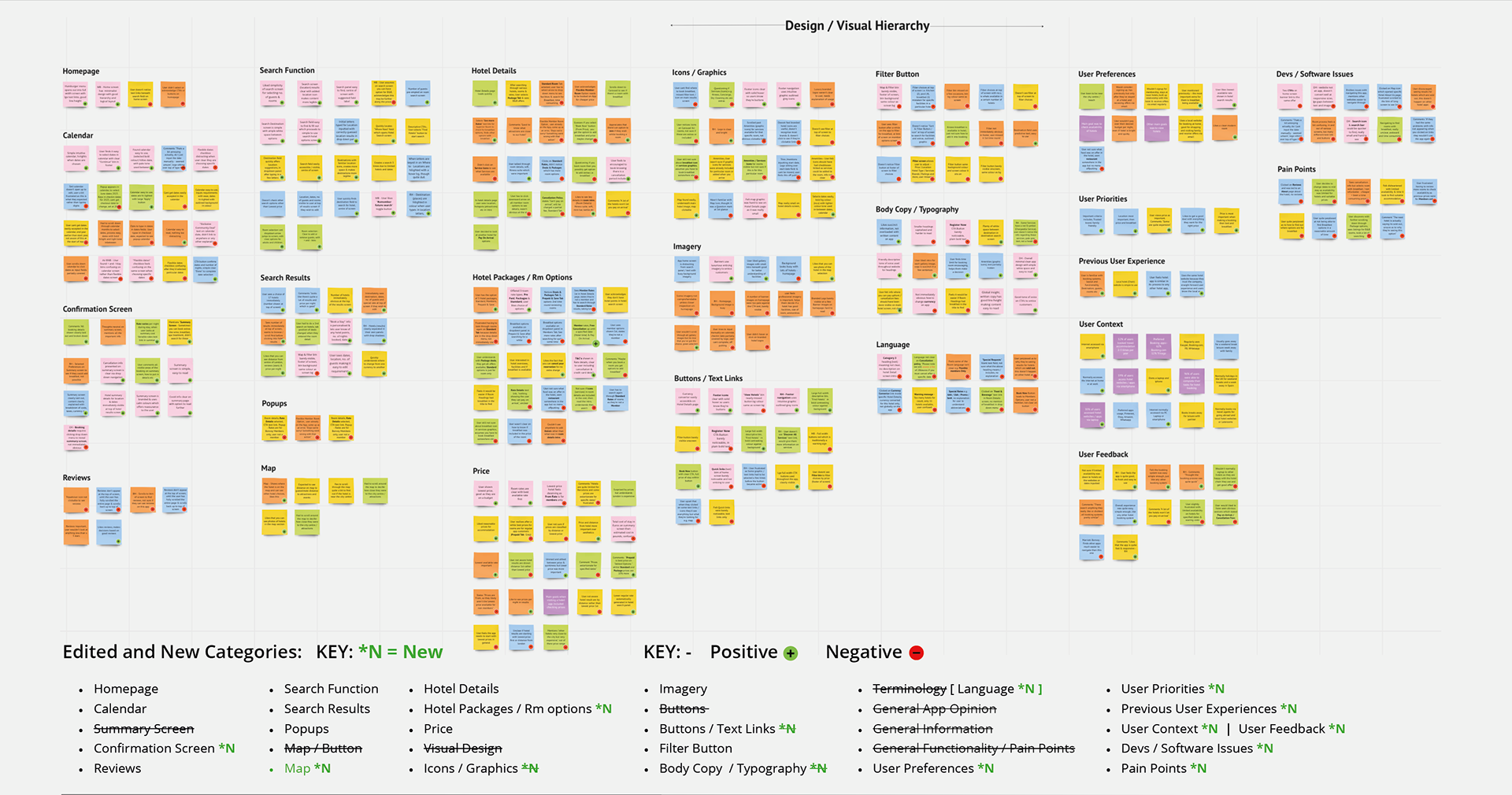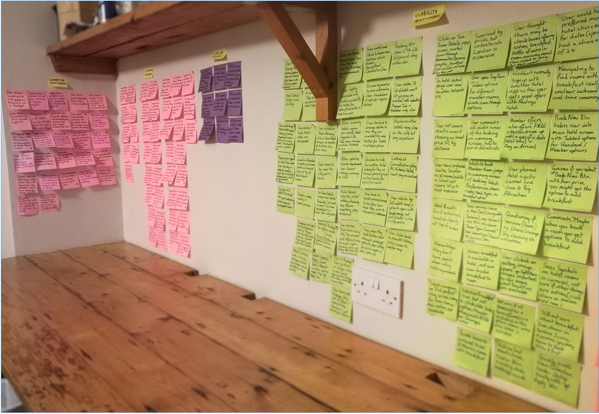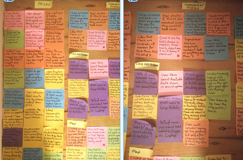 The next part of the process was to create an Affinity Diagram from all the research gained from the Competitive benchmark, Online Survey, Usability tests and notetaking.