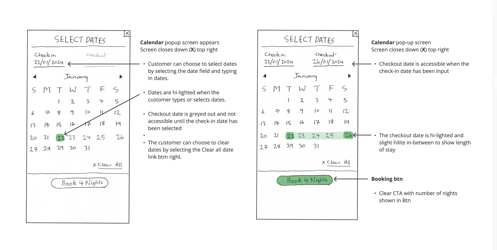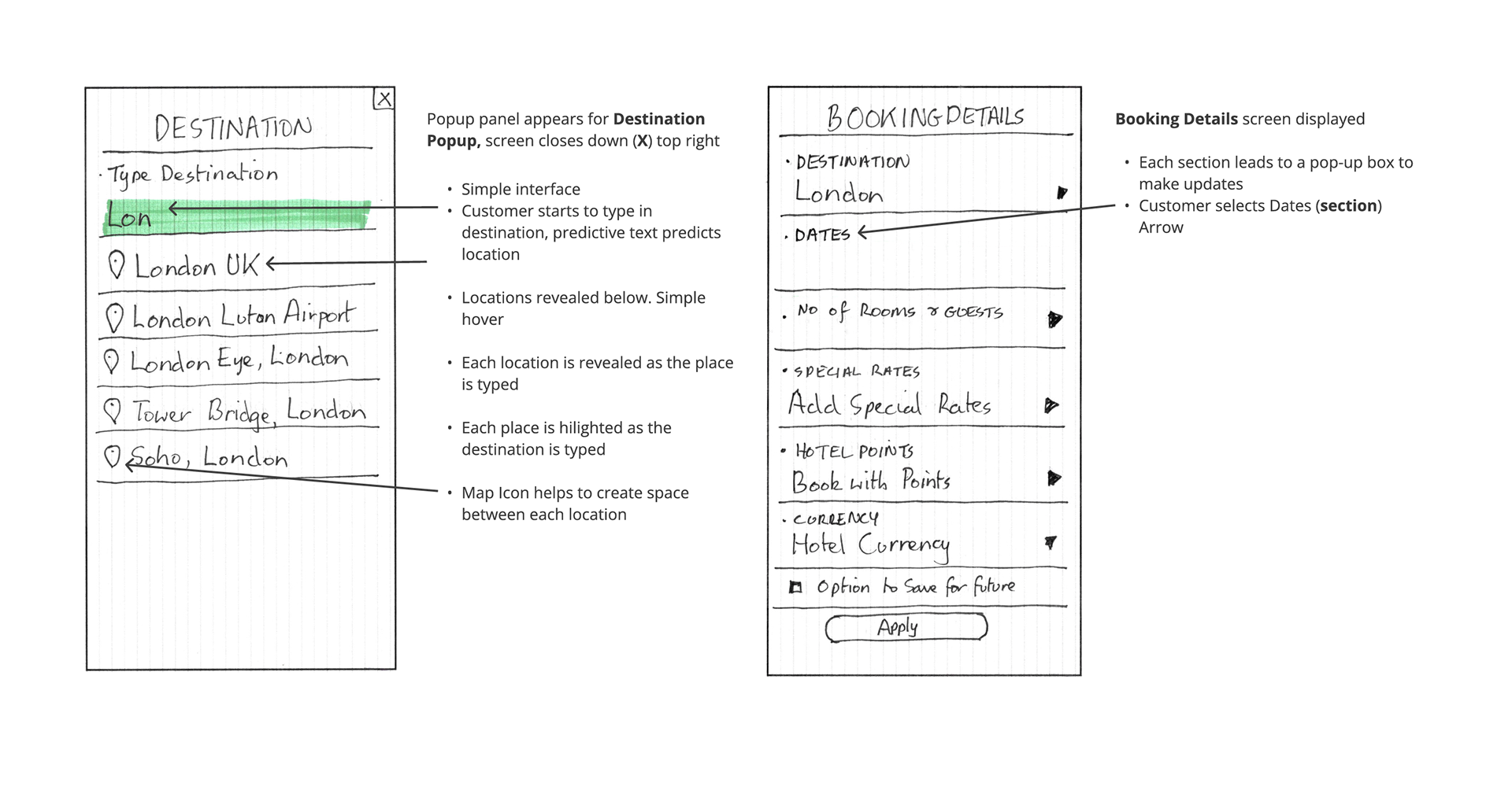 At this stage of the design task, I had to sketch screens for the hotel mobile booking process based on the flow diagram.