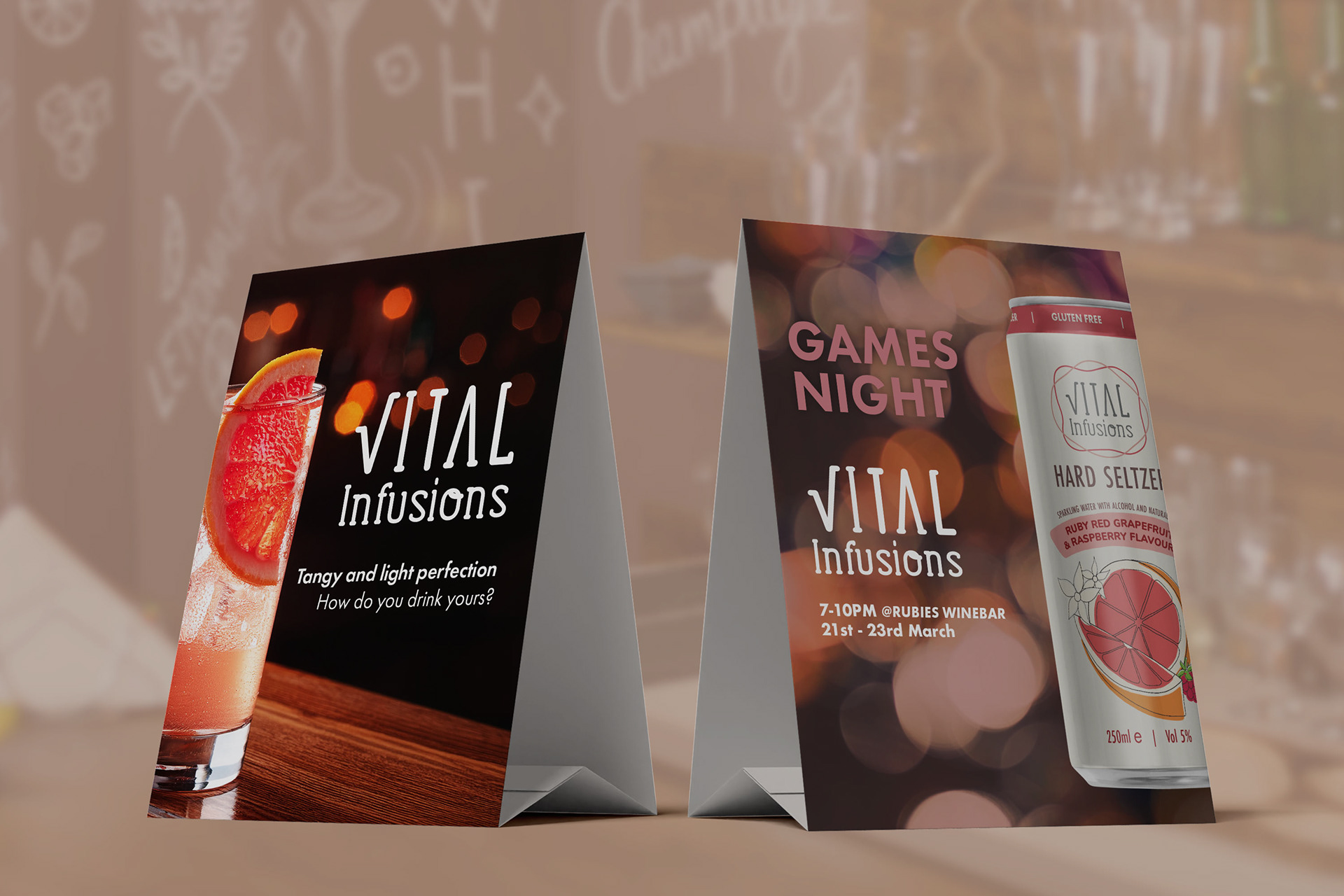 I picked the name and logo for VITAL INFUSIONS to show that drinks are made for people who would like lower calorie, healthier alcoholic drinks options.